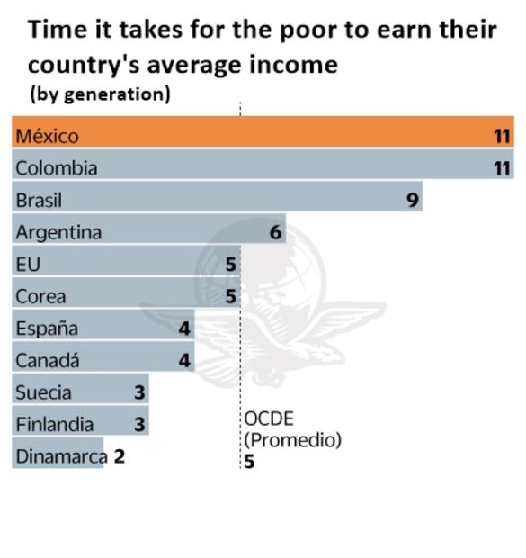 In Mexico , as well as Colombia , it takes up to 11 generations for a child born in poverty to reach the average level of income in their country. According to the Organization of Economic Co-operation and Development (OCDE) .