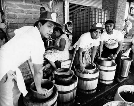La tradición de hacer nieves de sabor lo dice claro: tienen que ser a mano, muy dulces y en barriles con hielo. Esta imagen es de marzo de 1984 y vemos a trabajadores de la nevería El Güero.