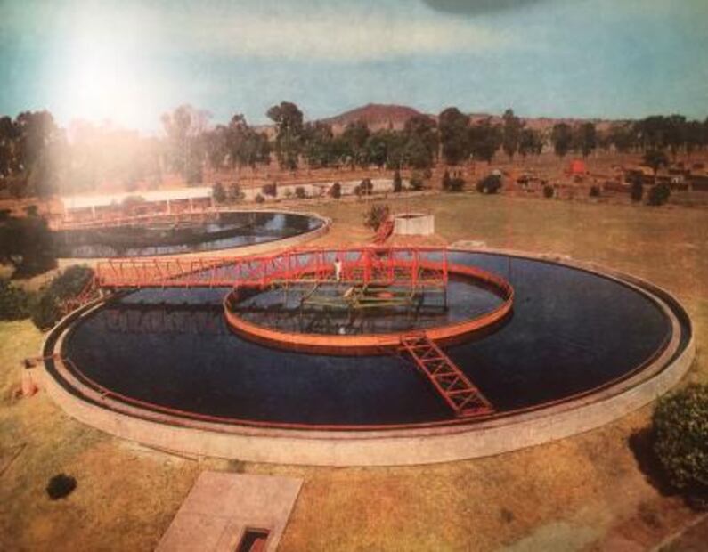 Postal de una planta de tratamiento de agua en los años sesenta, cuya infraestructura estaba hecha para dos funciones: potabilizar el vital líquido y también para distribuirla para regar áreas verdes, como el Bosque de Chapultepec o los campos de Ciudad Deportiva. Colección Villasa - Torres / D.D.F.