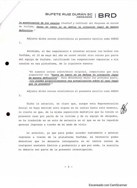 Se trata de dos documentos en los que la creadora de contenido solicita a la fiscalía le ayuden a resolver su caso, pues según señala, la situación le afectó en sus ganancias, ya que YouTube le notificó la suspensión de monetización de sus videos hasta que se definiera su situación legal.