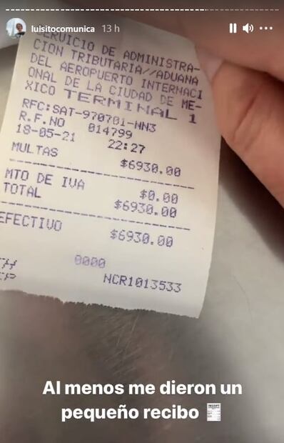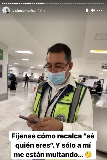 A través de sus estados en Instagram, el youtuber Luisito Comunica informó lo ocurrido en las instalaciones del Aeropuerto de la Ciudad de México, donde un policía lo detuvo y lo llevó a unas oficinas para que pagara una multa de 7 mil pesos por usar su teléfono celular. En medio de la confusión, Luisito documentó lo que tuvo que hacer para poder irse a su casa junto con su novia después de estar "detenidos" y bajo vigilancia durante tres horas aproximadamente.