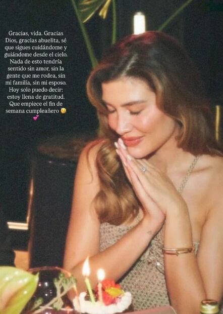 “Gracias Vida. Gracias Dios, gracias abuelita, sé que sigues cuidándome y guiándome desde el cielo. Nada de esto tendría sentido sin amor, sin la gente que me rodea, sin mi familia, sin mi esposo. Hoy solo puedo decir: estoy llena de gratitud”, escribió junto a una fotografía en la que se le ve dichosa.