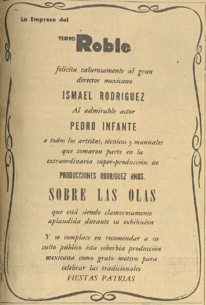 “Sobre las olas está siendo clamorosamente aplaudida durante su exhibición, y se complace en recomendar a su culto público esta soberbia producción mexicana como grato motivo para celebrar las fiestas patrias”