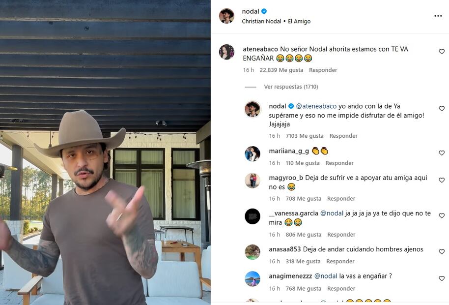 Nodal, quien también estrenó hace unas horas "El Amigo" y presume su amor con Ángela en el video del tema, respondió algunos mensajes en redes donde al invitar a disfrutar de su nuevo tema, muchos le mencionaron y le preguntaron por "Con otra", la canción de su ex.