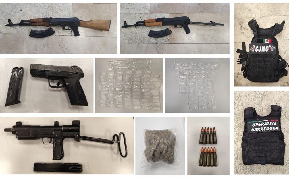 Y aseguraron chalecos tácticos con la leyenda “Operativa Barredora” y “CJNG”, armas de fuego de distintos calibres, cartuchos útiles de uso exclusivo de las Fuerzas Armadas y envoltorios con posible droga.