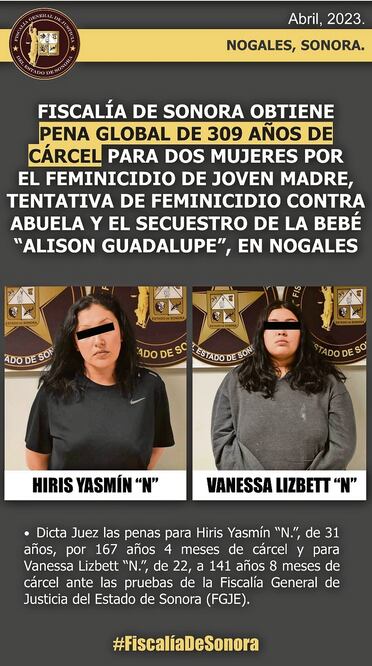 Tras un intenso operativo de elementos de la Agencia Ministerial de Investigación Criminal, la Fiscalía de Sonora localizó el 8 de mayo en un domicilio de Agua Prieta a la pequeña Alison Guadalupe sana y a salvo, y detuvo a Hiris Yasmín “N” y Vanessa Lizbett “N”, lo que concluyó con la sentencia de 309 años para las dos.