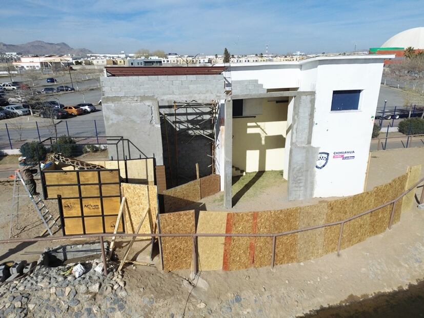 La caja que transporta a la jirafa Benito del Parque Central de Ciudad Juárez al parque de conservación de vida silvestre Africam Safari en Puebla, llegó a Juárez esta mañana y se instaló a un costado de su casa.
