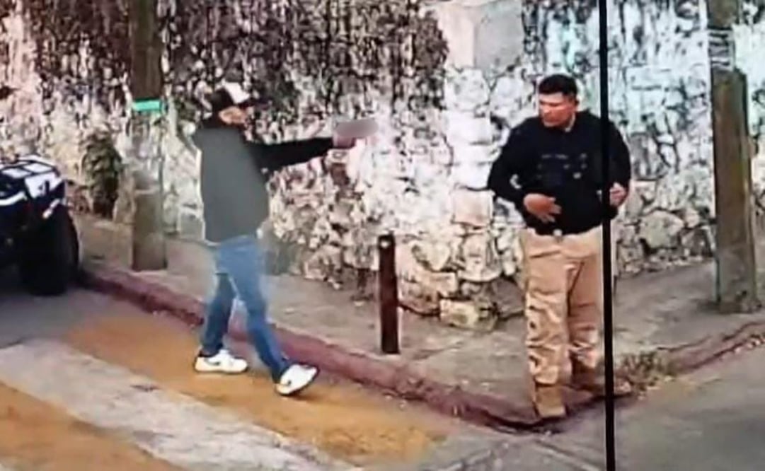 En un video que tiene la Fiscalía General del Estado se ve a un hombre de unos 25 años de edad, vestido con pantalón de mezclilla, gorra, sudadera negra y tenis blancos justo en el momento en que se aproxima al policía víctima y le dispara a la cabeza.