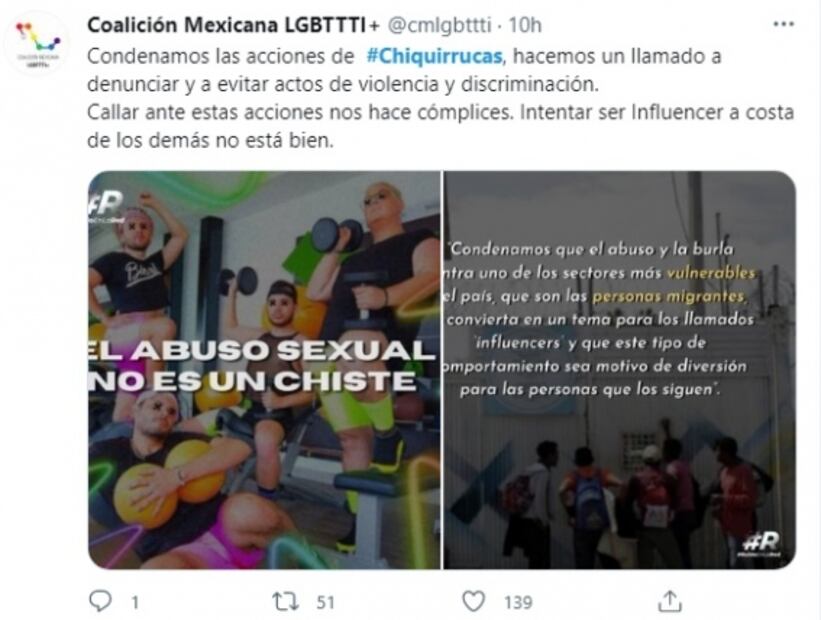 Ante el presunto abuso sexual de "las chiquirrucas" en contra de un migrante, la Coalición Mexicana LGBTTTI+ condenó las acciones. "Hacemos un llamado a denunciar y a evitar actos de violencia y discriminación. Callar ante estas acciones nos hace cómplices. Intentar ser Influencer a costa de los demás no está bien", señalaron.