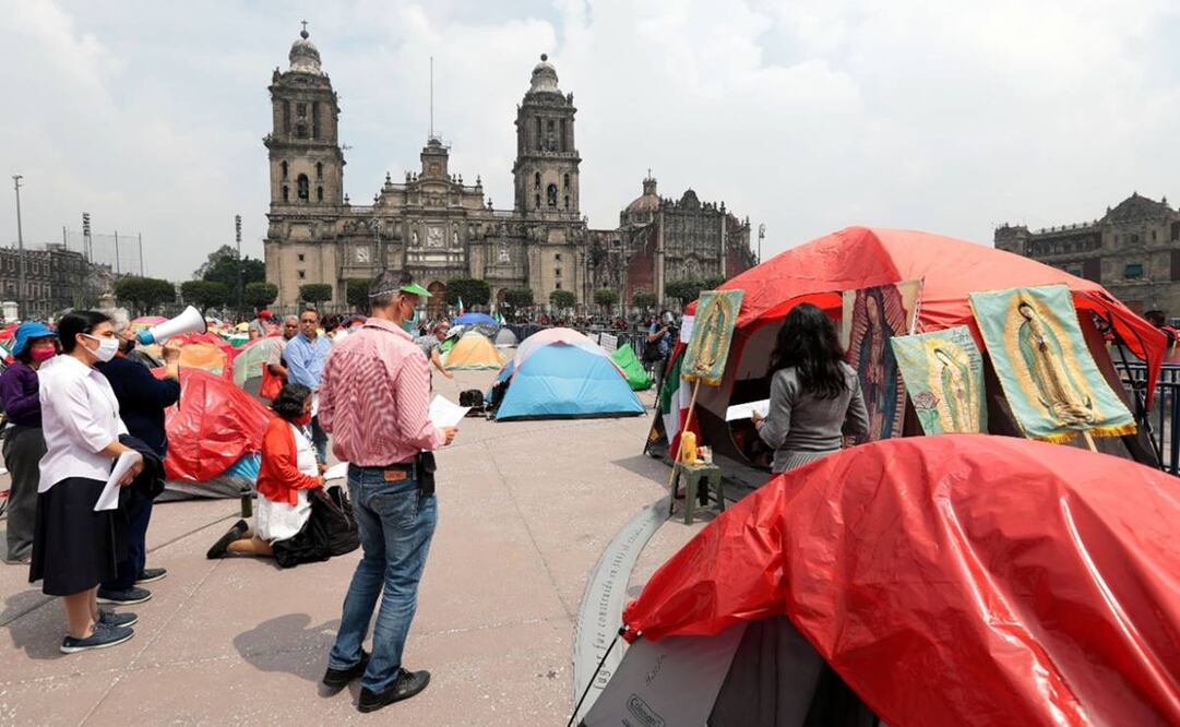 Miembros del Frente Nacional AntiAMLO celebraron una misa entre casas de campaña e imágenes religiosas en la plancha del Zócalo capitalino