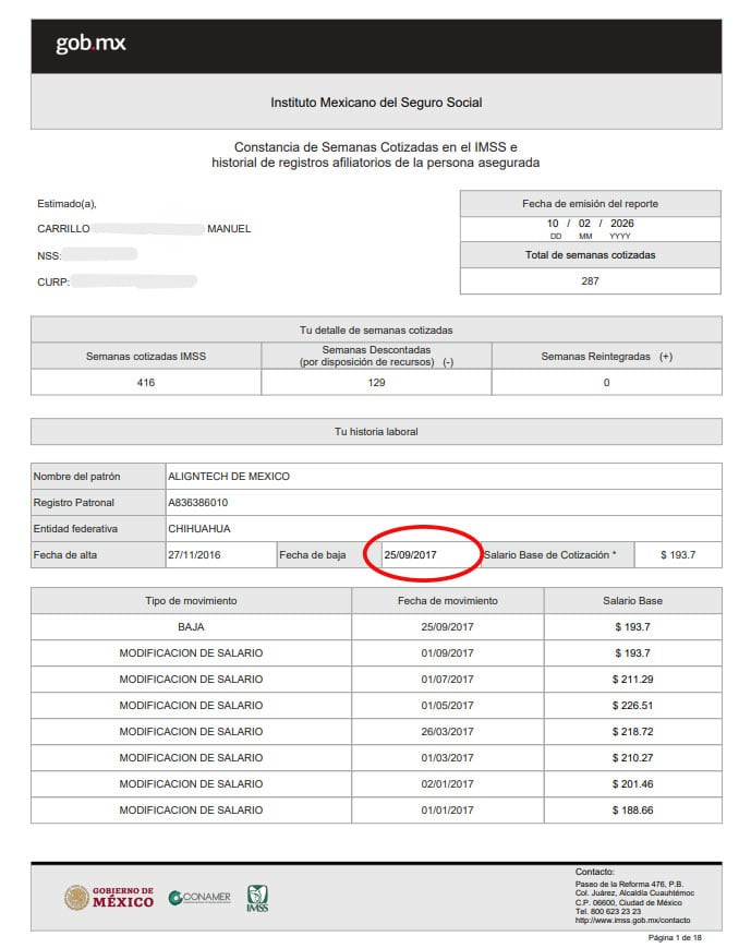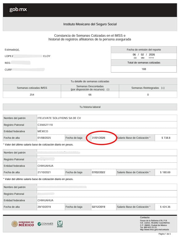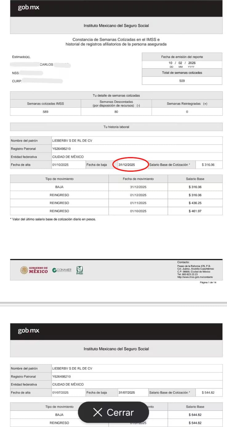En otro caso, Eloy López ingresó 48 mil pesos netos en enero en DiDi para estar asegurado en febrero. La aplicación le descontó la cuota del seguro pero lo dio de baja del IMSS el 31 de enero. Actualmente su constancia de semanas cotizadas aparece con un último salario base de cotización de 738 pesos, pero cuando tramitaba este mismo documento en meses anteriores su salario base de cotización era de 315 pesos, un cambio al que no le encuentra explicación y le parece un dato falseado.