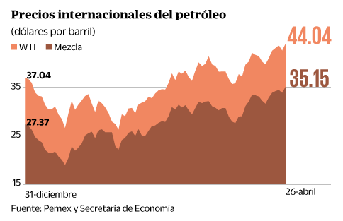 El WTI cerró la sesión con un avance de 3.28%, cotizando al cierre en 44.04 dólares por barril, lo cual intensifica las ganancias del peso y de otras divisas de países productores de materias primas. En el caso de la mezcla mexicana, esta llegó a 35.15 dólares por tonel, lo que significó un alza de 3.78%, para llegar a su nivel más alto desde el 11 de noviembre del año pasado.