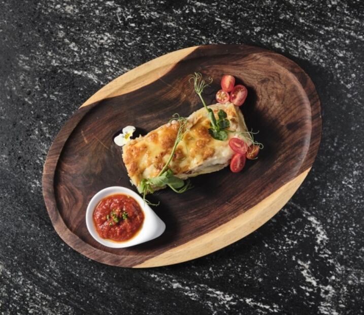 3. En un recipiente para hornear, haz una capa de calabaza, encima una capa de queso Edam, y una más de berenjena, tomate, y una más de nata; y así sucesivamente hasta llegar al borde y la última capa será de tomate y ramitas de romero.