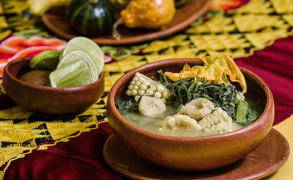 El chef Israel Loyola, del restaurante El Parián Atelier, en Oaxaca, nos explica que él la suele preparar con piojito y chepiche, que son quelites de la zona que crecen alrededor de la calabaza. Al caldo se añade una bolita de masa de maíz para espesarlo y se cocina con estas hierbas, los elotes, las guías de la calabaza y sus flores.