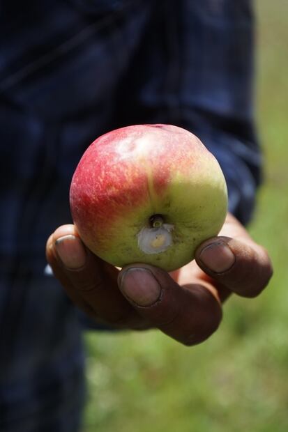Otro problema actual con los árboles de fruta es que el excremento de pájaro que seca y debilita las hojas y el cambio climático que ha hecho que se desplacen cada vez más a las zonas más altas (el granizo, por otro lado, también dificulta mantenerlas sanas), dice Fredy. “Soy de familia que se ha dedicado a la fruticultura, pero aparte estudié técnico en agricultura para poder manejar esto. Hoy los jóvenes son difíciles: no les gusta el trabajo. Tenemos un centro de bachillerato con formación agropecuaria porque el campo es futuro”, explica.