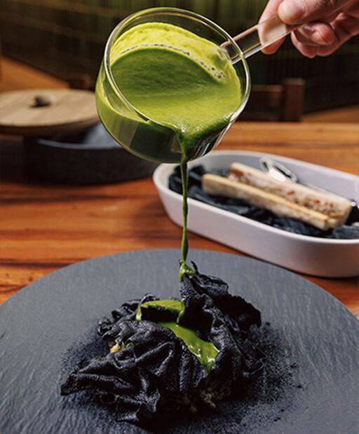 Continúa con frutos del mar, una tartaleta hecha con recado negro y rellena con sikil pak, hecho a base de pepita de calabaza con habanero, mejillones zarandeados estilo Nayarit, y unos ostiones de Ensenada con un decante de ceviche, percebes, flor de sauco y lima kaffir. Para este punto, el Chardonnay 2022 de Santos Brujos, armonizaría bien, con notas en nariz a fruta verde y melón, que en boca se presenta untuoso, de acidez controlada y ligero amargor, con un retrogusto a almendra y larga permanencia.
