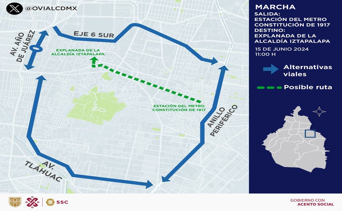 Continúa marcha sobre tres carriles de Ermita Iztapalapa al Poniente a la altura de Rafael Moreno, con un carril libre a la circulación, del Metro “Constitución de 1917” hacia la explanada de la alcaldía Iztapalapa.