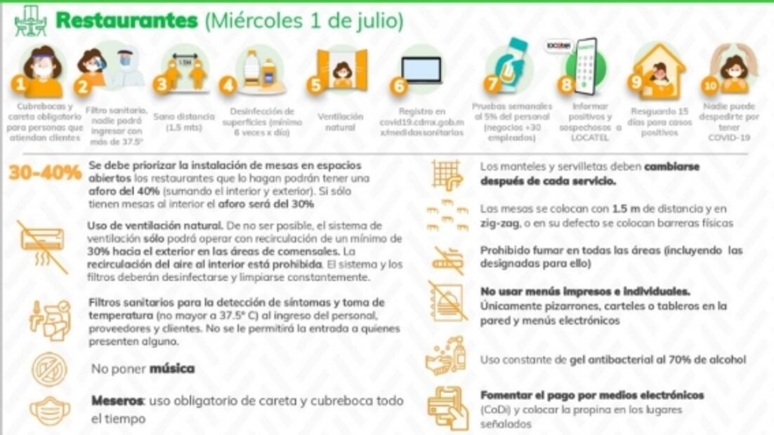 En tanto, hoteles y restaurantes podrán volver a sus actividades a partir del miércoles 1 de julio , los primeros podrán tener una capacidad del 30%, mientras que a los segundos se les tiene permitido abarcar hasta el 40%, siempre y cuando cuenten con espacios al aire libre.