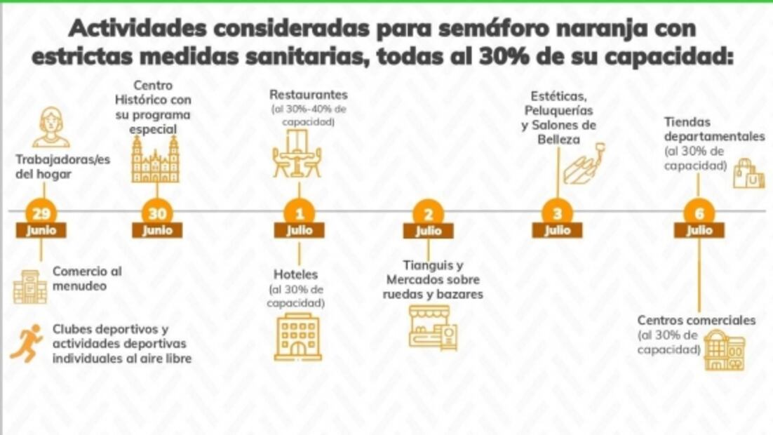 La jefa de gobierno de la Ciudad de México , Claudia Sheinbaum Pardo, anunció que a partir del próximo lunes la capital pasará al semáforo naranja por la epidemia por coronavirus, por lo que regresarán algunas actividades.