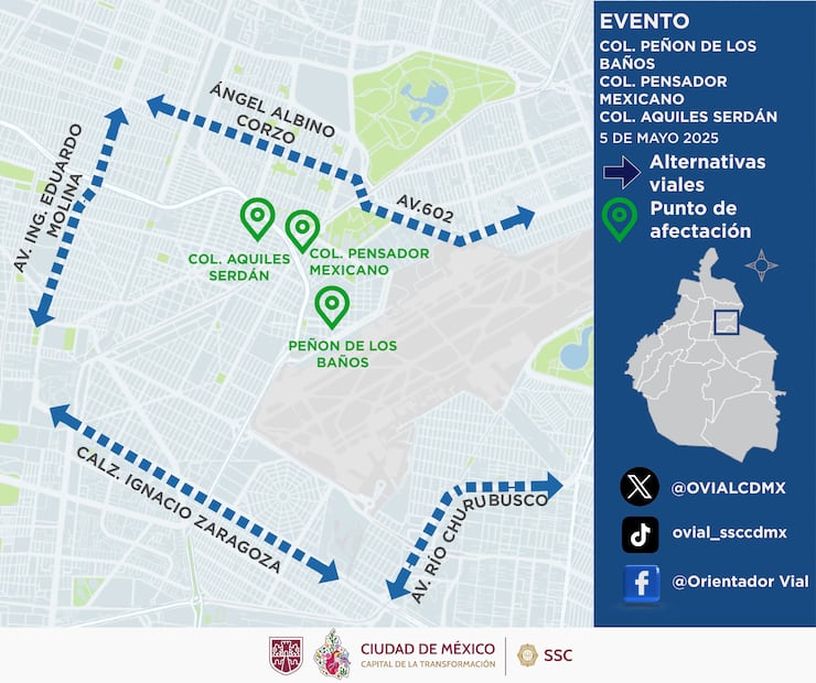 - Desfile de la Batalla de Puebla ingresa de Circuito Interior a Av. Oceanía al Sur, colonia Peñón de los Baños, alcaldía Venustiano Carranza. Alternativa vial: Eje 3 Oriente.
