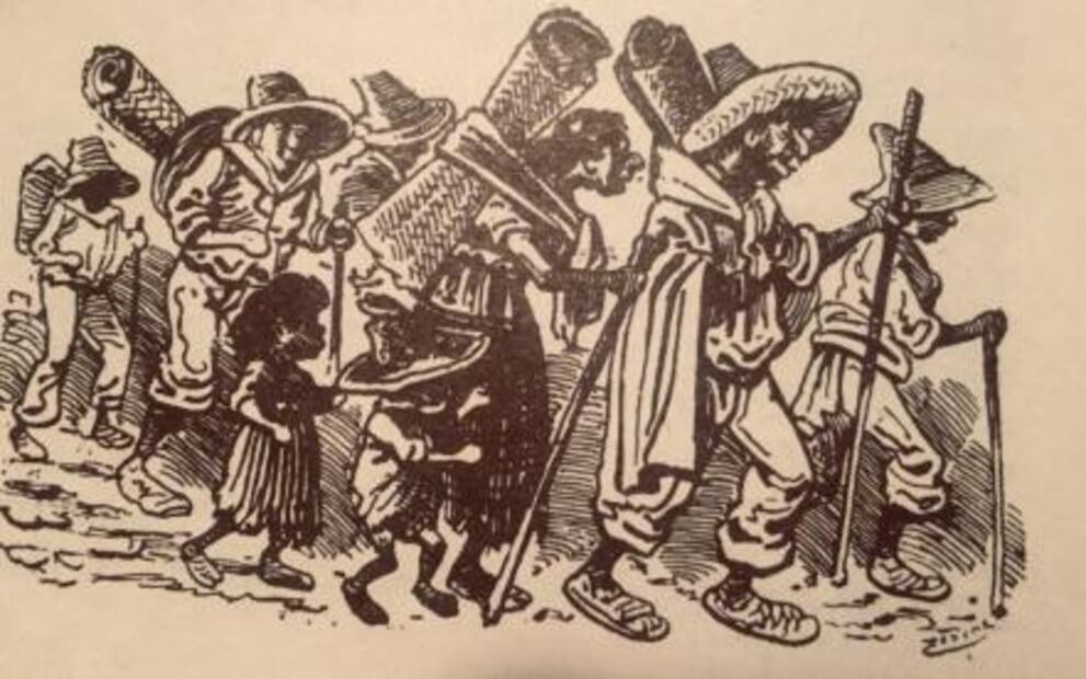 Grabado que ilustra el desplazamiento de un grupo de personas durante la Revolución. Colección Villasana - Torres.