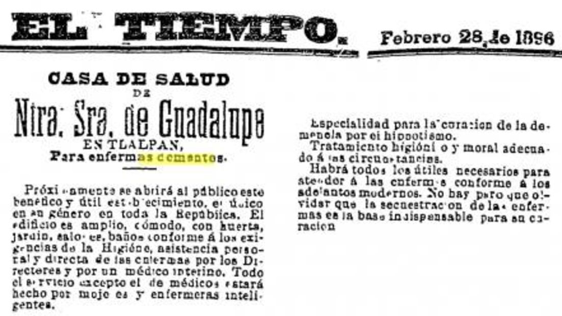 La recomendación médica de acudir a Tlalpan para reposar siguió durante el siglo XIX y para sus décadas finales -aproximadamente 1880-, cuando se empezó a tener avances en el tratamiento psiquiátrico , la ahora alcaldía fue elegida por los doctores más relevantes y pioneros de esta rama, como lo fueron Rafael Lavista o Adrián De Garay , para establecer clínicas especializadas en salud mental , como lo fue la Casa de Salud de Nuestra Señora de Guadalupe , abierta en 1896.