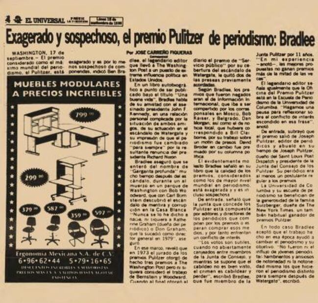 Plana de EL UNIVERSAL con la opinión del editor del Washington Post, Ben Bradley, que comenta que es exagerado y sospechoso de componentes el premio Pulitzer en una publicación del 18 de septiembre de 1995.