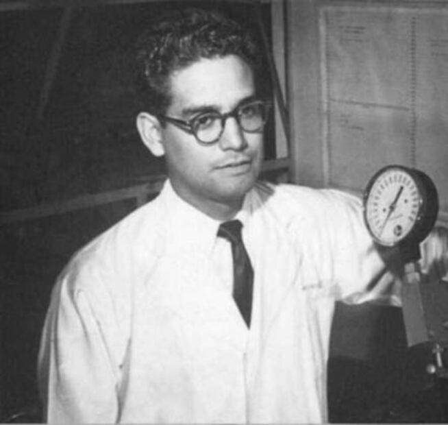Luis Miramontes en su laboratorio de Syntex en 1651. Estudió en la Escuela Nacional de Ciencias Químicas de la UNAM, en Tacuba, de 1945 a 1949. Foto tomada del sitio oficial de Luis Ernesto Miramontes Cárdenas del IFUNAM.