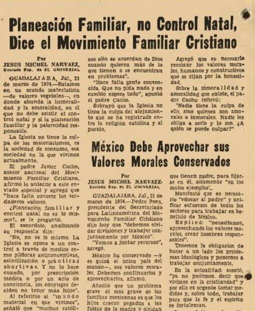 Plana del 22 de marzo de 1974 donde se publicó que “Planificación familiar, no control natal” la Iglesia no estaba de acuerdo con el uso de métodos como las pastillas anticonceptivas. Hemeroteca de EL UNIVERSAL.