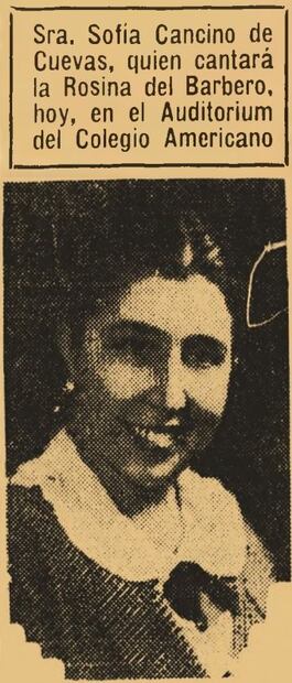 “Hoy por la noche habrá una fiesta en el Auditorium del Colegio Norteamericano organizada por distinguidas familias de nuestra sociedad para presentar a la contralto mexicana señora Sofía Cancino de Cuevas, quien cantará “La Rosina” de “El Barbero de Sevilla” (...) Han estado circulando las invitaciones para esta fiesta, entre muy distinguidas personas. La representación de la inmortal obra comenzará a las nueve en punto". Nota publicada en EL UNIVERSAL el 21 de julio de 1938.