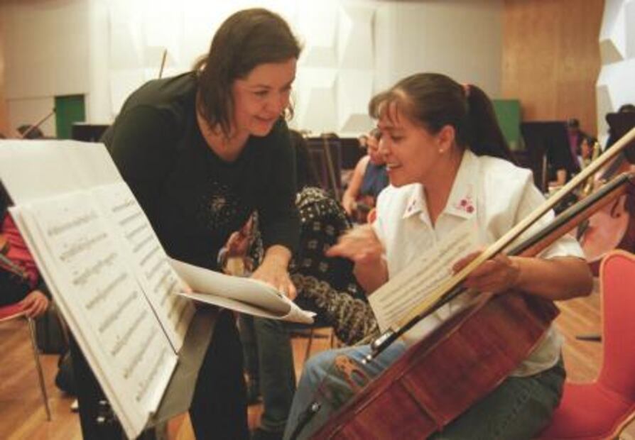 Ser música por mucho tiempo se refirió a ser una persona descarada, aprovechada y envidiosa, de acuerdo con una investigación de la maestra Citlalin Ulloa Pizarro. La investigadora cuestiona cómo la utilización del término femenino para esta profesión se presta a otras interpretaciones “y también abre vertientes de reflexión para los estudios de género (...) en donde en muchas culturas como la nuestra, lo femenino a menudo ha designado el lado despectivo”, escribe. Foto: Ensayo de la Orquesta Sinfónica de Mujeres del Nuevo Milenio dirigida por Gina Enríquez, en una sesión del 30 de junio de 2003. Crédito: Eduardo Loza.