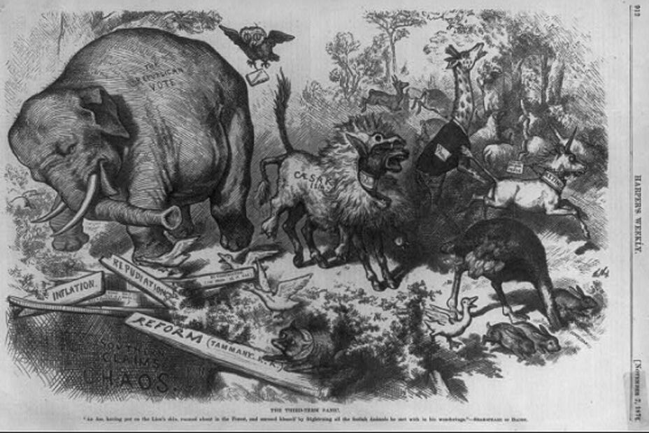 De la misma manera en que la figura del burro se consolidó como el ícono Demócrata , el elefante se popularizó como el símbolo del partido Republicano en 1874 con otra caricatura de Thomas Nast : “Pánico de la tercera administración: Un burro que portaba la piel de un león, rugía y se divertía en el bosque asustando a todos los torpes animales que se cruzaban en su camino” (“ The Third Term Panic: An ass, having put on the Lion’s skin, roamed about in the forest, and amused himself by frightening all the foolish Animals he met with in his wanderings ”).