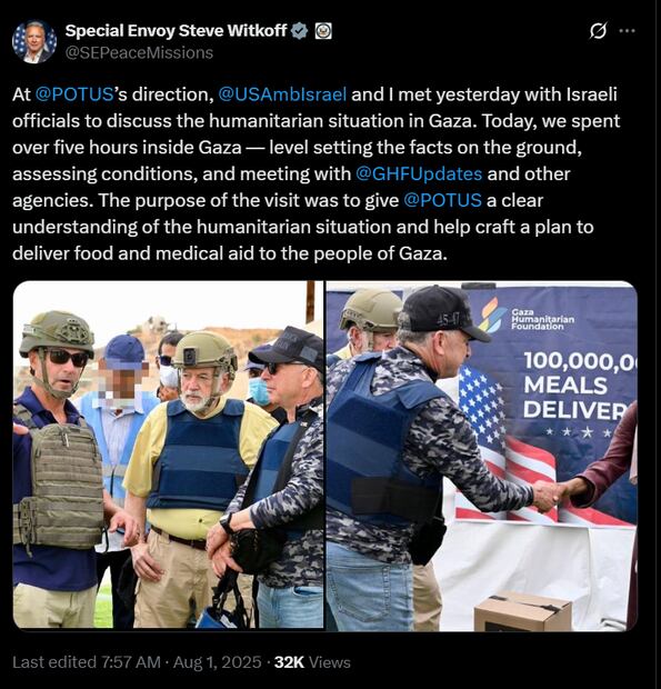 Witkoff dijo que había pasado más de cinco horas en Gaza, en un mensaje en X que incluye una foto en la que aparece con un chaleco antibalas junto con el personal de un centro de distribución de GHF.