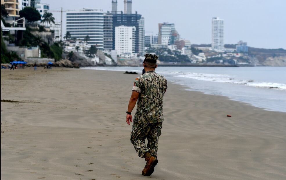 Un integrante de la Armada ecuatoriana vigila la playa El Murciélago, en Manta, Ecuador, el 30 de julio de 2025. Habitantes y turistas de algunas islas fueron evacuados de forma preventiva ante la alerta de tsunami. Foto: EFE
