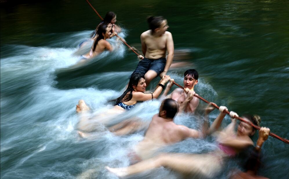 Varias personas se cuelgan de una cuerda en el arroyo Eisbach en el Jardín Inglés en Múnich, Alemania (01/07/2025). El Servicio Meteorológico alemán alertó de una ola de calor con temperaturas que alcanzarán los 38 grados centígrados en gran parte del país. Foto: EFE