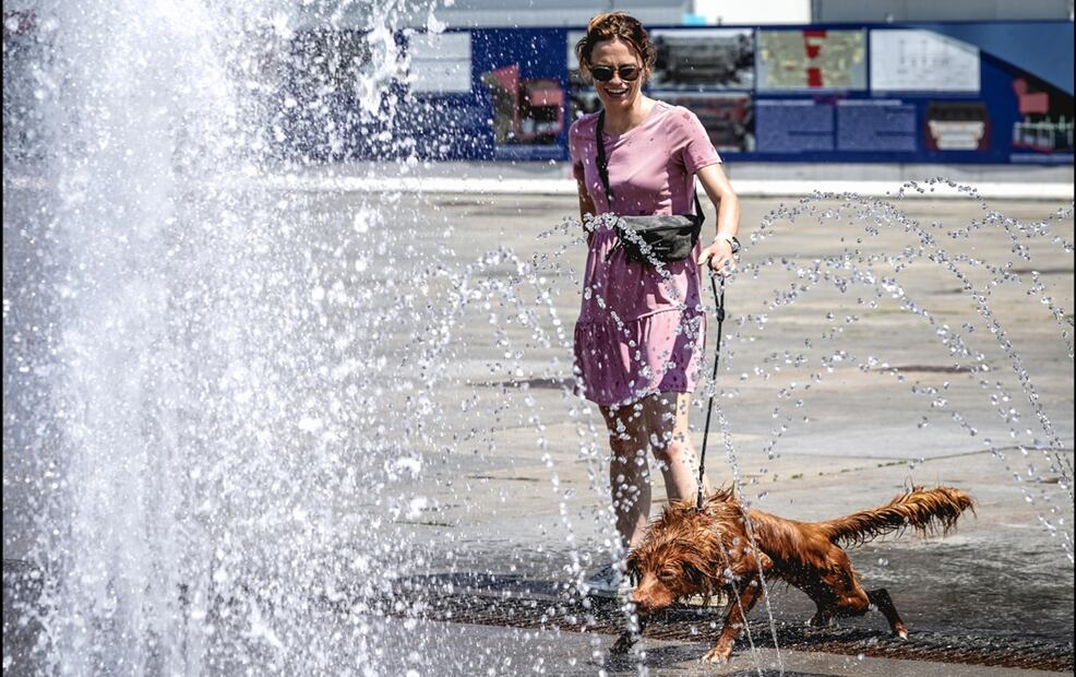 Una mujer acerca a su perro para que se refresque en la fuente de la Piazza Castello en Turín, Italia (01/07/2025). El Ministerio de Salud italiano declaró alerta roja en todo el país debido a las temperaturas extremas. Foto: EFE