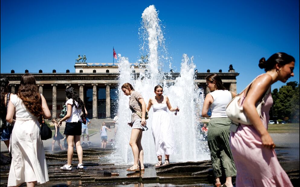 Varias mujeres se refrescan en una fuente en el parque Lustgarten durante un caluroso día en Berlín, Alemania, el miércoles 2 de julio de 2025. El Servicio Meteorológico Alemán advierte de una ola de calor con temperaturas que alcanzarán los 38 grados Celsius en gran parte del país. Foto: EFE