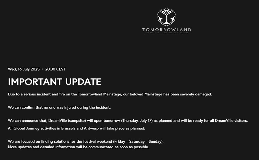 “Debio a un serio incidente e incendio en el escenario principal de Tomorrowland, nuestro querido Mainstage fue severamente dañado. Podemos confirmar que nadie resultó herido durante el incidente. Podemos anunciar que DreamVille [el sitio de campamento] abrirá mañana como estaba planeado y estará preparado para los visitantes. Las actividades de Global Journey en Bruselas y Antwerp se realizarán como estaba programado”, escribieron desde la organización.