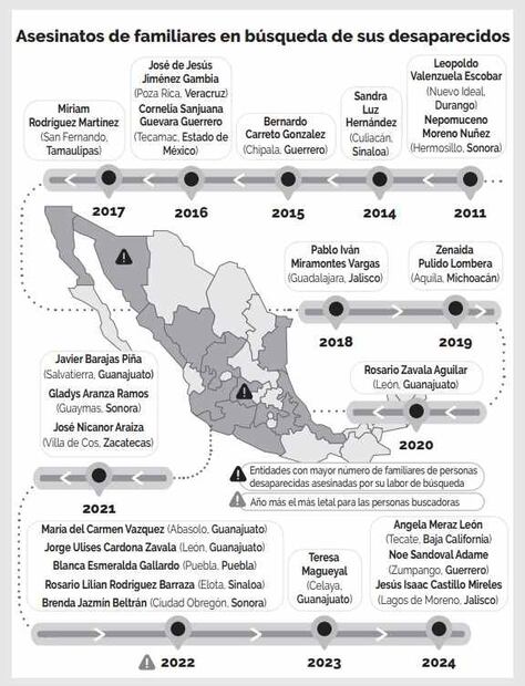De febrero del 2011 a agosto de 2024 se han registrado 22 asesinatos de familiares de personas desaparecidas cometidos en 13 estados del país, de acuerdo con el Movimiento por Nuestros Desaparecidos en México. Además, durante el sexenio de Andrés Manuel López Obrador desaparecieron 9 personas buscadoras.