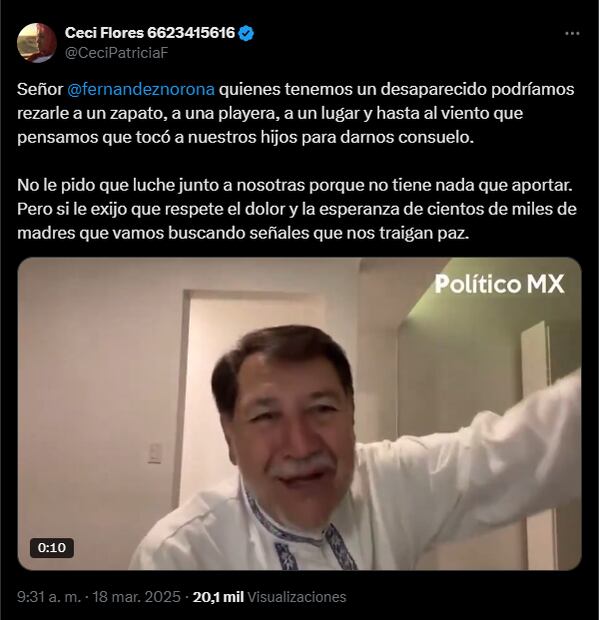 Ceci Flores es mamá de víctimas de desaparición forzada, y forma parte del colectivo Madres Buscadoras de Sonora, por lo que, tras los comentarios de Fernández Noroña que defienden al gobierno de la presidenta Claudia Sheinbaum y cuestionan la veracidad del hallazgo de las prendas y calzado en el Rancho Izaguirre, señalado como un crematorio clandestino del crimen organizado, la activista pidió respeto al legislador morenista para los familiares de personas desaparecidas.