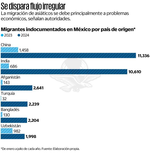 A pesar de que los migrantes originarios de Centroamérica, en especial de Guatemala, El Salvador y Honduras, continúan como los de mayor tránsito en territorio nacional para tratar de llegar a Estados Unidos, existen otros grupos que silenciosamente han incrementado su presencia en el país, como las personas originarias de China, cuya entrada ilegal de enero a julio de este año aumentó en 672% con relación a 2023, al pasar de mil 458 a 11 mil 366, de acuerdo con la Unidad de Política Migratoria, de la Secretaría de Gobernación (Segob).