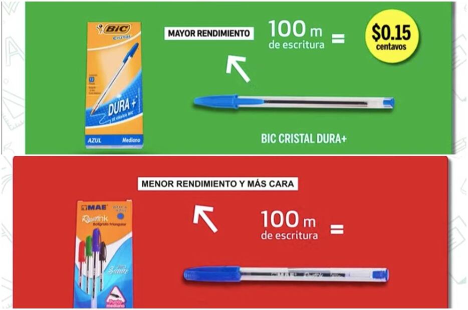 “Solo el modelo de la marca Bic superó los tres kilómetros de escritura y presentó el mayor rendimiento pues 100 metros de trazo cuestan 15 centavos. La peor pluma y más cara fue Mae ya que con ella la misma cantidad de escritura cuesta 75 centavos. Esto quiere decir que una Bic rinde lo de siete de la marca Mae”.