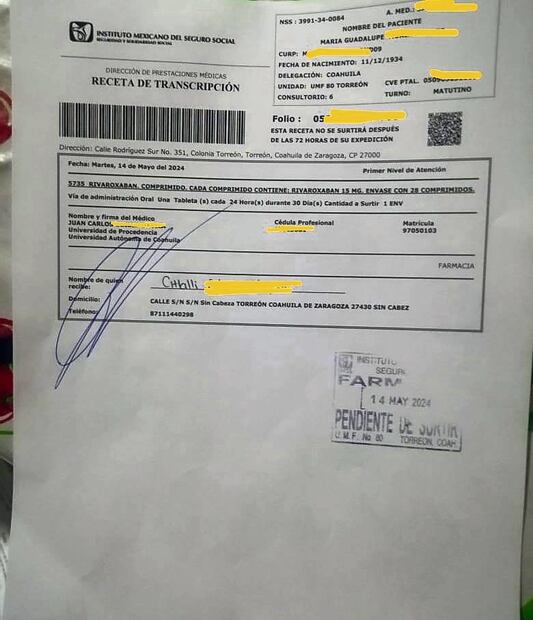 La Unidad de Medicina Familiar número 80 también expidió rivaroxaban de 15 mg y escitalopram con 10 mg, fármacos que no les han surtido el IMSS ni la Megafarmacia desde hace dos meses.