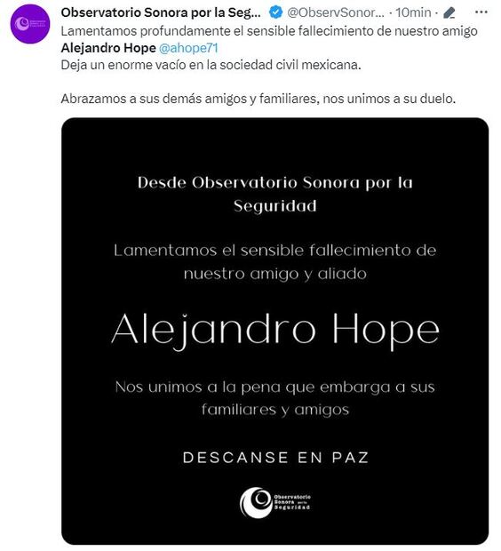 En un mensaje difundido desde el perfil del analista de seguridad, sus familiares agradecieron las "muestras de cariño y solidaridad" que han recibido, por lo que detallaron que el servicio funerario se llevará a cabo en la Funeraria Gayosso en Santa Fe a partir de las 17: horas de este viernes.
