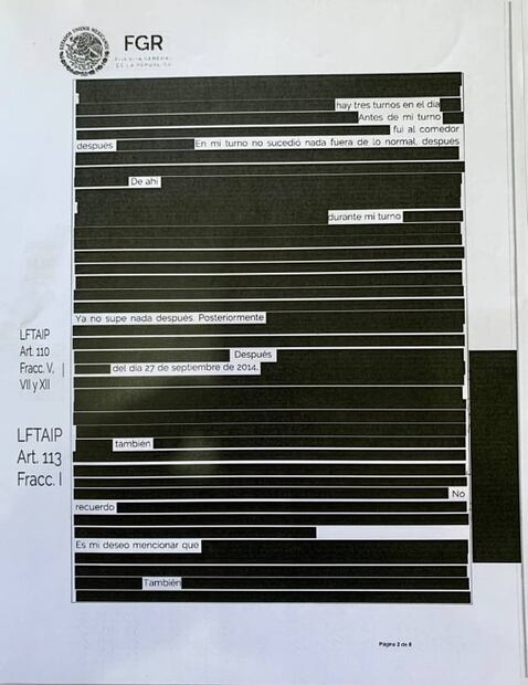 Obligada por la Ley de Transparencia tras un recurso de revisión, la FGR entregó 239 hojas con amplias zonas testadas de las versiones del personal militar que pudo conocer información o participar en la desaparición de los 43 jóvenes de la Escuela Normal Rural Raúl Isidro Burgos , de Ayotzinapa, Guerrero . Las declaraciones son ilegibles. Hay hojas que tienen sólo dos palabras sin tachar, y otras donde sólo se pueden leer palabras como “después”, “no recuerdo”, “no recuerdo bien” o “26 de septiembre”. En otras páginas se pueden ver párrafos completos que no contienen información sustantiva que ayude a conocer los hechos del 26 y 27 de septiembre de 2014.