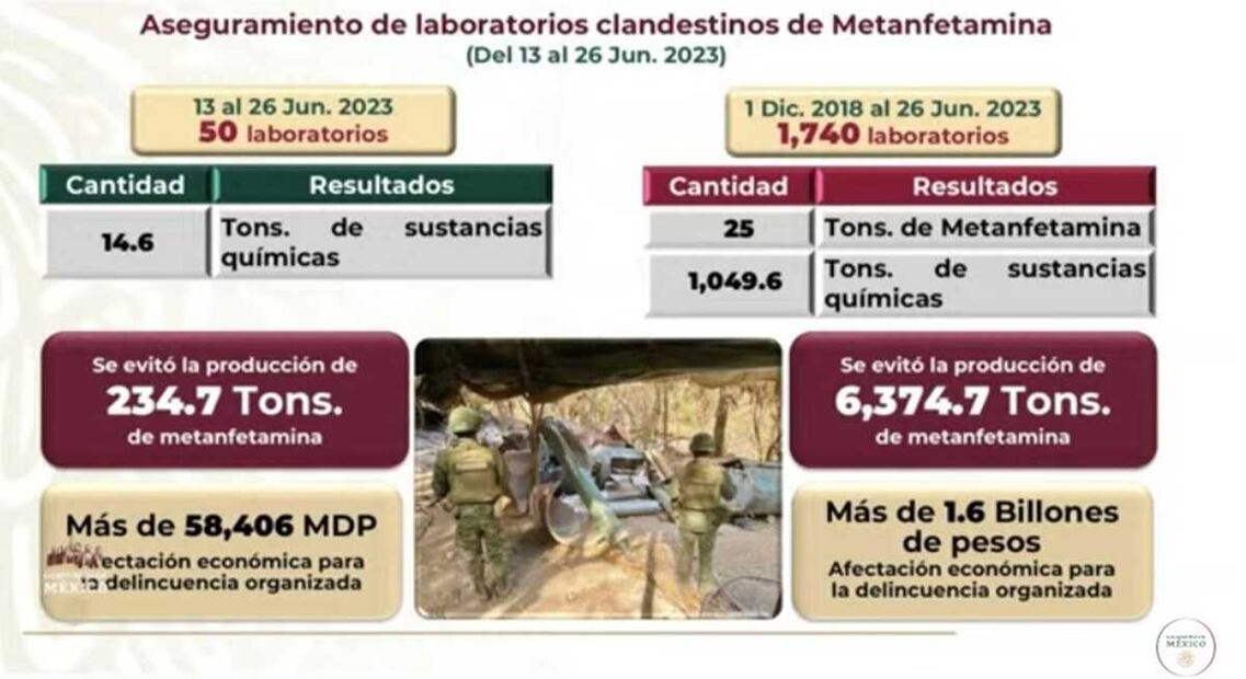 Detalló que con esta destrucción de laboratorios se evitó la producción de 6 mil 374 toneladas de metanfetaminas, lo que ha significado una afectación económica de 1.6 billones de pesos a la delincuencia organizada.