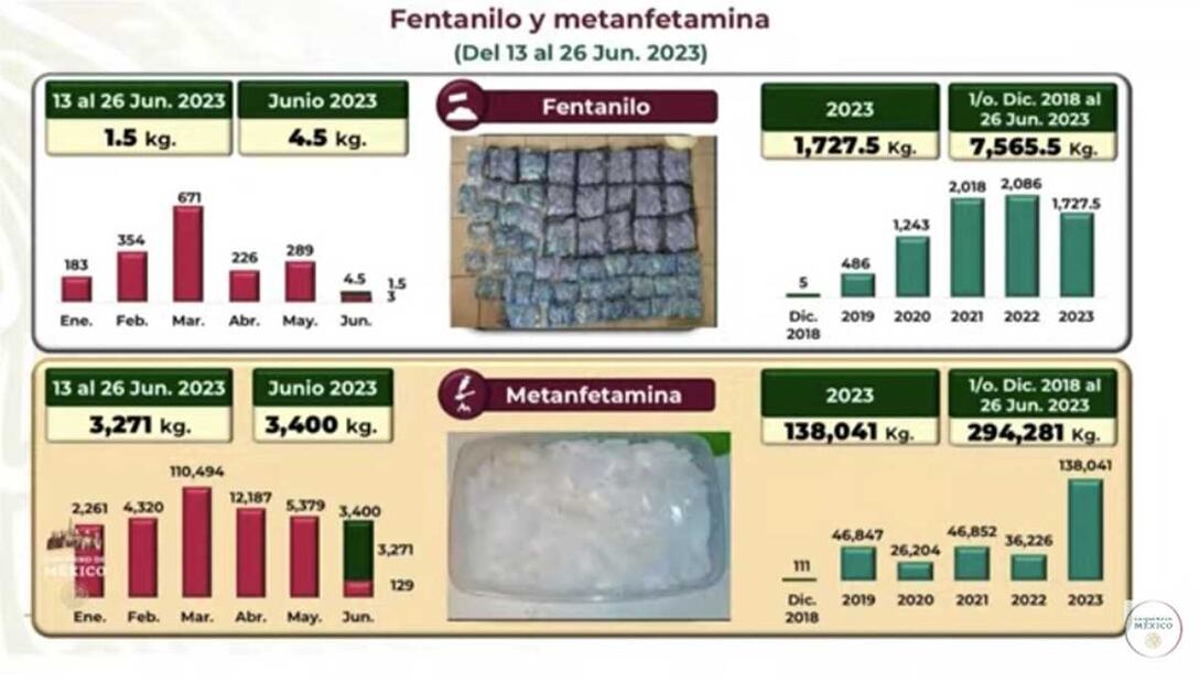 “El aseguramiento de fentanilo en el periodo (ha sido de) 1.5 kilogramos; 4.5 kilogramos en el mes; mil 727.5 kilogramos durante el año y en la administración 7 mil 565.5 kilogramos de fentanilo.