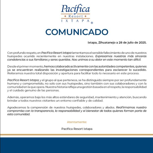 Seis días después, el hotel Pacífica Resort Ixtapa emitió un comunicado confirmando la muerte de uno de sus huéspedes dentro de sus investigaciones, asegurando que han colabrado con las autoridades para esclarecer lo sucedido.