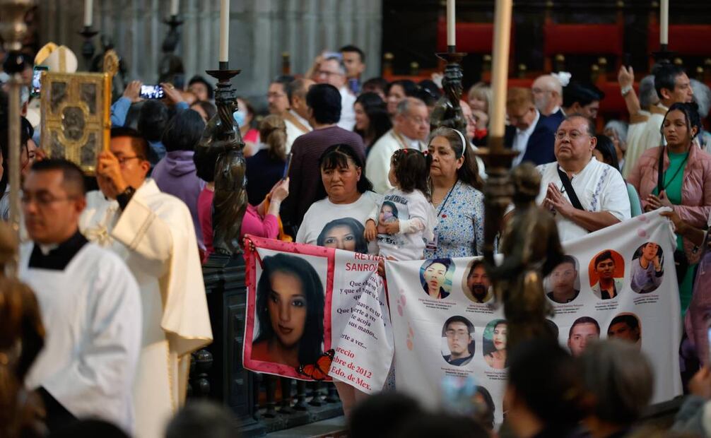 En la misa asistieron integrantes del colectivo Uniendo Esperanzas Estado de México y Una Luz en el Camino; durante el lavatorio, madres buscadoras dieron gracias y extendieron lonas con las fichas de búsqueda de sus hijos e hijas.