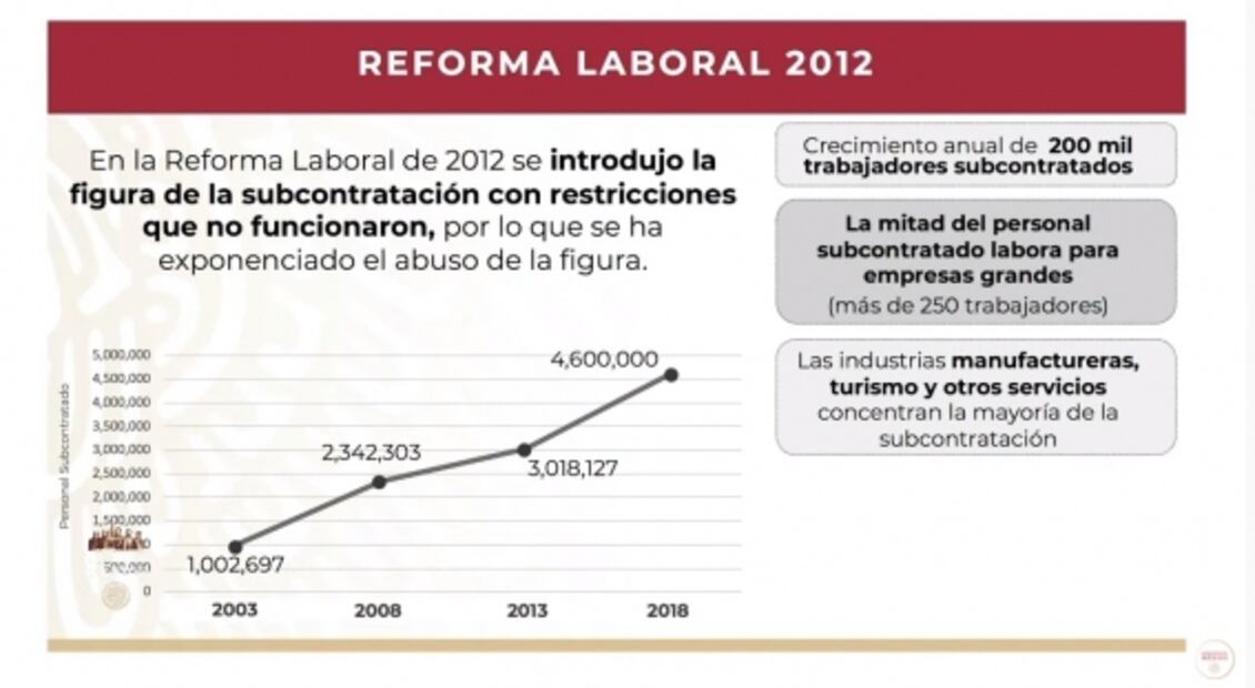 07:23: La secretaria del Trabajo señala que en la Reforma Laboral de 2012 se introdujo la figura de subcontratación con restricciones que no funcionaron.